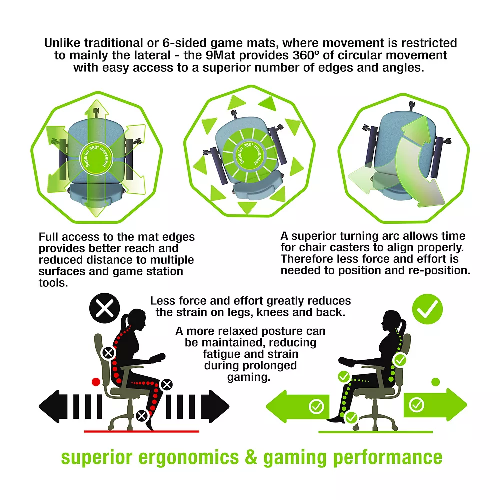 - The 9Mat has an easy-glide surface for smooth chair movement which may help reduce leg fatigue. This mat is made from strong polycarbonate which will not crack, dent, discolor, curl or smell.